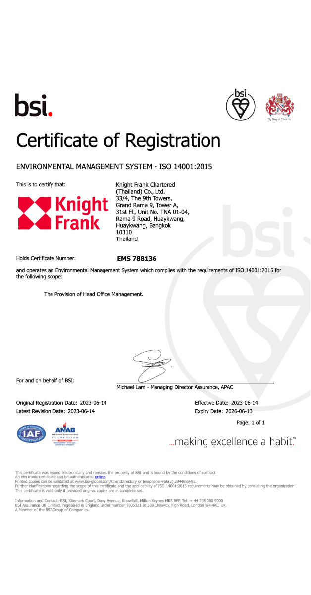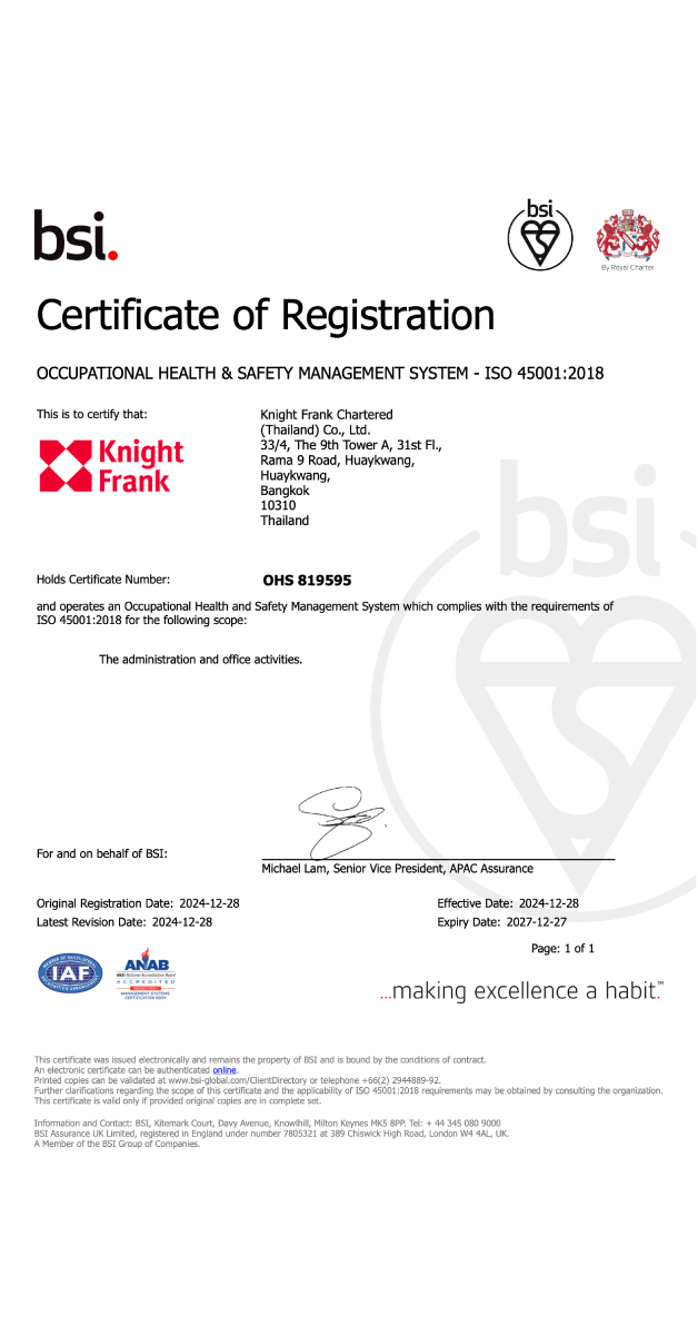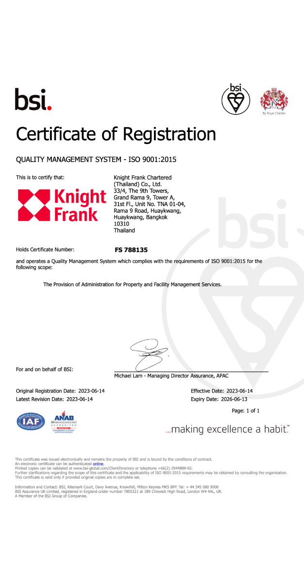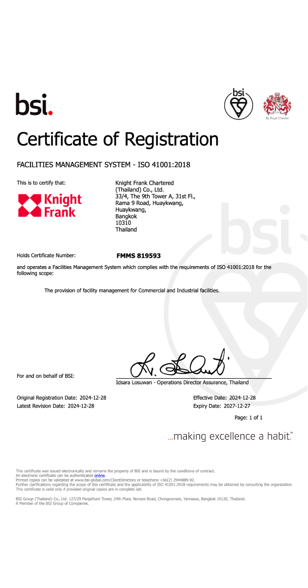 แก่เจ้าของอสังหาริมทรัพย์ ผู้เช่า และลูกค้า เพื่อเสริมสร้างคุณภาพและเพิ่มมูลค่าสินทรัพย์ โดยดำเนินงานภายใต้มาตรฐานการบริหารจัดการ ISO ต่อไปนี้